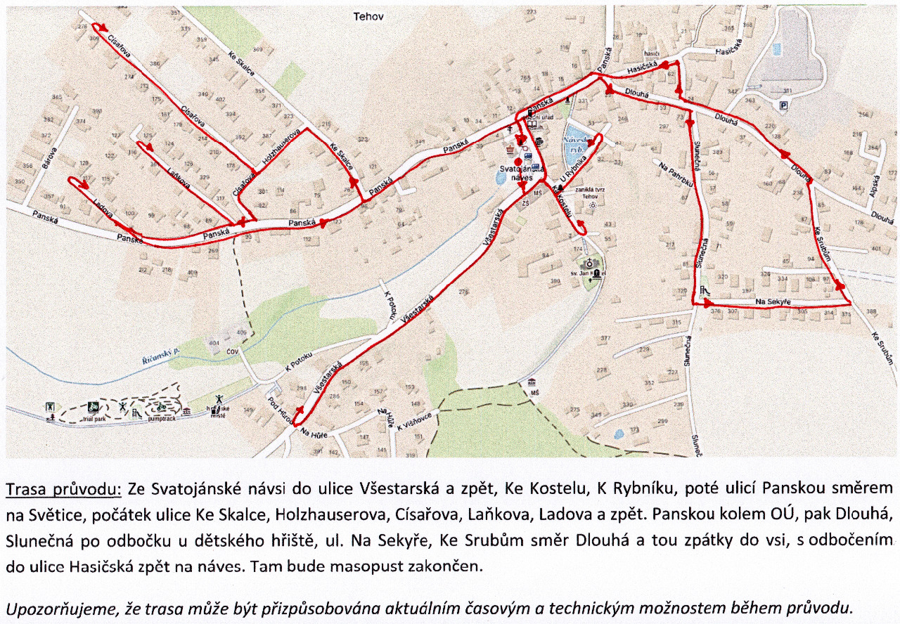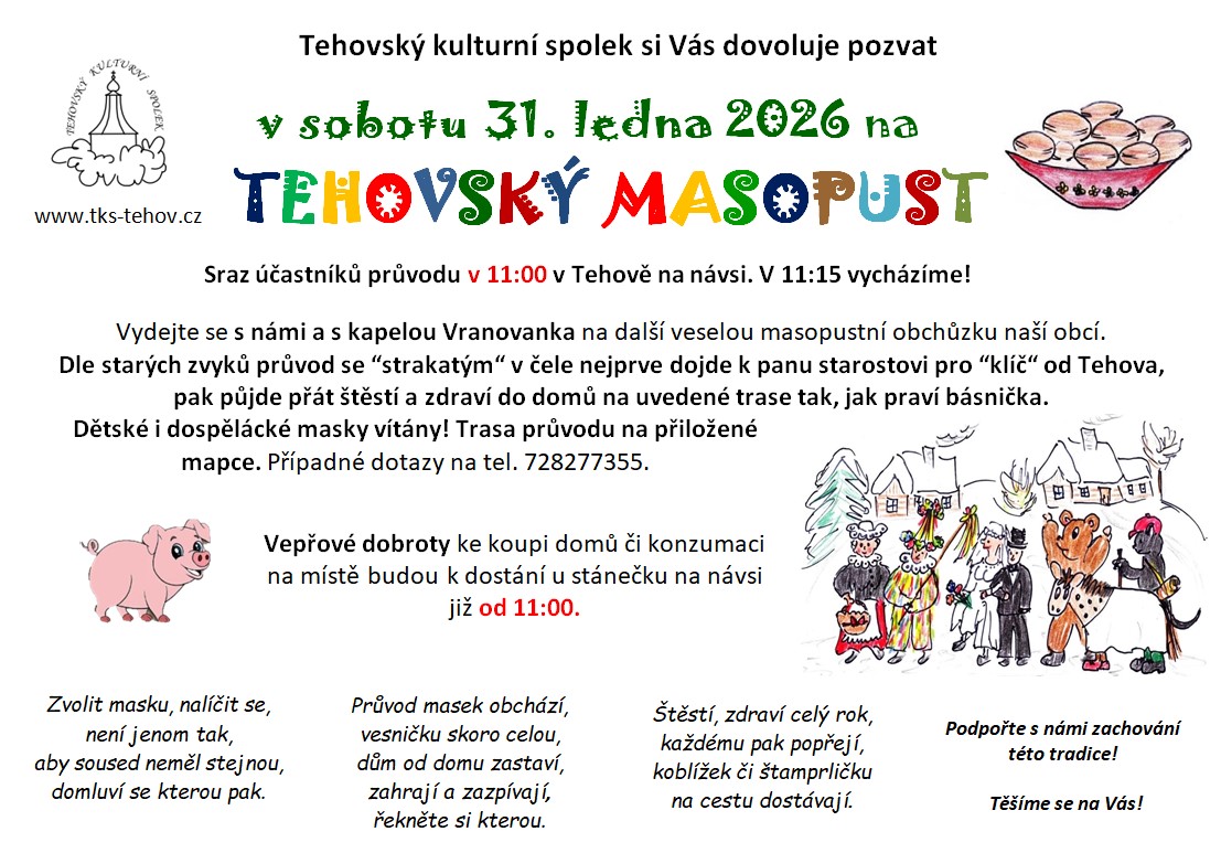 Tehovský kulturní spolek zve všechny v sobotu 31. ledna na TEHOVSKÝ MASOPUST. Sraz účastníků průvodu i prodej vepřových dobrot v 11 hodin na návsi. Všechny podrobnosti masopustu jsou na přiložené pozvánce a mapce trasy průvodu. Vítáme dětské i dospělácké masky, těšíme se na Vás!